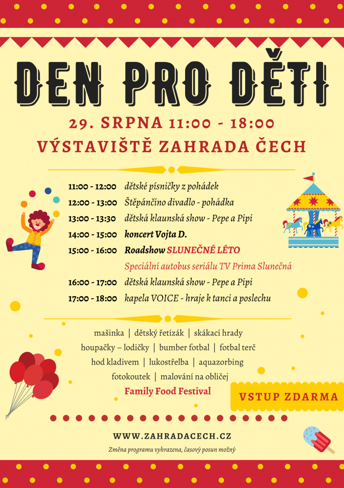 Připraven je také kulturní program. V průběhu odpoledne děti potěší loutkové Štěpánčino divadlo, klaunská pouť Pepe a Pipi, autobus populárního seriálu Slunečná a mnoho dalšího.