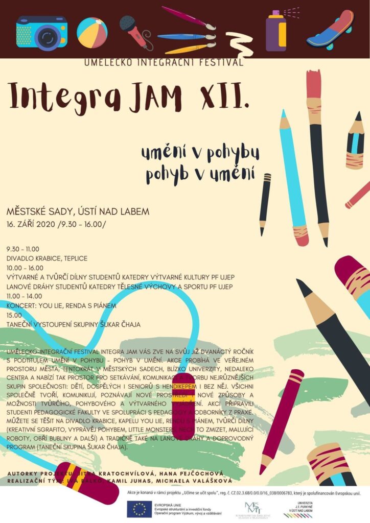 Ústí nad Labem – Studenti pedagogické fakulty Univerzity Jana Evangelisty Purkyně dali hlavy dohromady a po roce opět pořádají Integra Jam – umělecko integrační festival pro všechny generace. Proběhne už tuto středu – 16. září v Městských sadech v Ústí nad Labem. Dvanáctý ročník oblíbené akce nabídne tradičně program všem věkovým kategoriím – nudit se nikdo nebude.