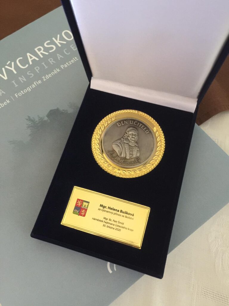 Lovosice – Náměstek hejtmana pro školství Ústeckého kraje Petr Šmíd předal Heleně Buškové ocenění za mimořádnou, kvalitní a obětavou činnost ve školství.