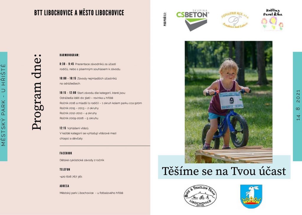 Libochovice – Pro děti do patnácti let jsou určené cyklistické závody, které se tuto sobotu 14. srpna pojedou v libochovickém městském parku. Soutěžit mohou i ti nejmenší, kteří si na kola ještě netroufnou – odrážedla jsou totiž povolena!