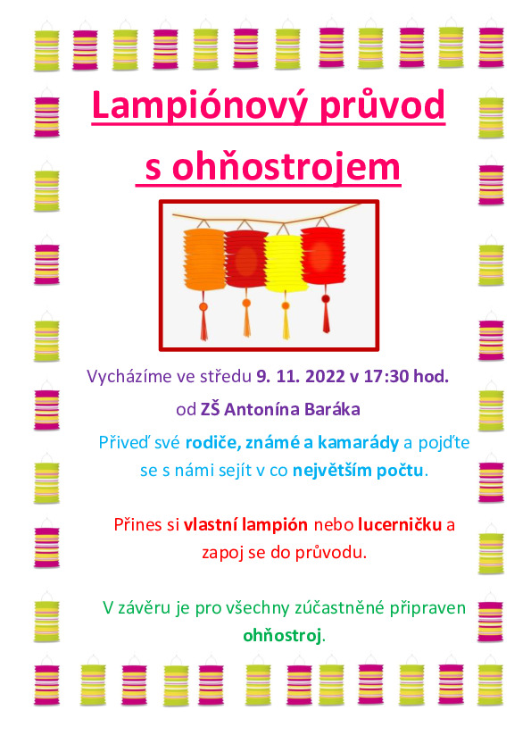 Lovosice – Přijďte ve středu 9. listopadu k Základní škole Antonína Baráka v Lovosicích a užijte si tradiční LAMPIONOVÝ PRŮVOD! Lampiony a lucerničky s sebou! Sraz zájemců je v 17.30 hodin u školy.