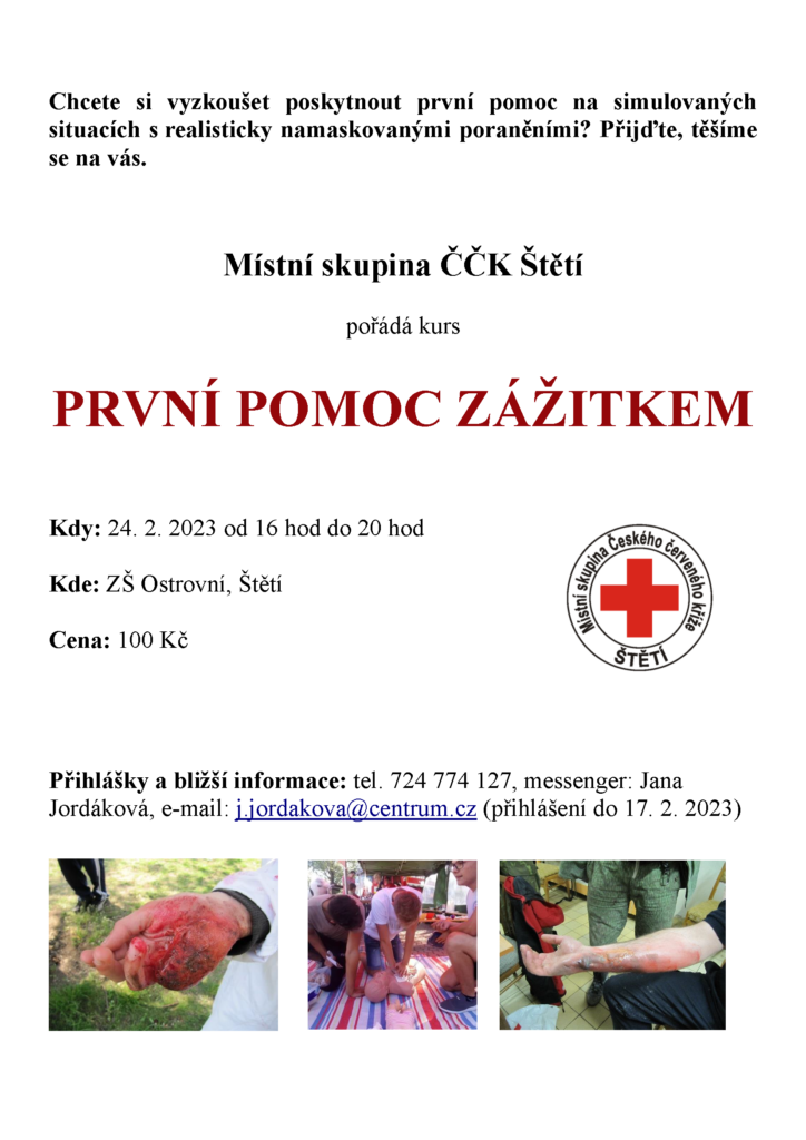 Nevíte, zda byste se zvládli zachovat správně při potřebě poskytnout první pomoc? Tak právě pro vás připravila Místní skupina Českého červeného kříže Štětí kurs z názvem První pomoc zážitkem. Budete mít příležitost vyzkoušet si první pomoc na simulovaných situacích s realisticky maskovanými poraněními.