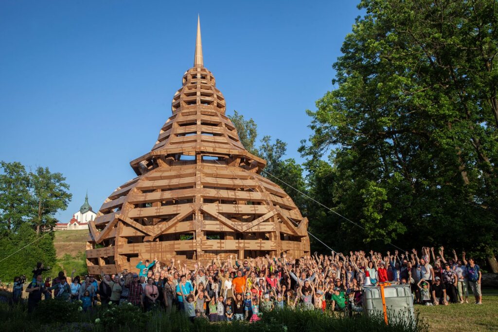 V sobotu 24. června tým Oliviera Grossetête s pomocí pěti stovek dobrovolníků, místních, turistů, dětí i seniorů stavbu sestavil a postupně i vyzdvihl. A zatímco v sobotu se museli řídit instrukcemi, v neděli dostali všichni (a hlavně děti) příležitost si zařádit. Monument bylo třeba strhnout, krabice rozdělit a použitý materiál sešlapat, aby mohl být převezen k recyklaci v Mondi Štětí, největší české papírně, kterou najdete na severu Čech.