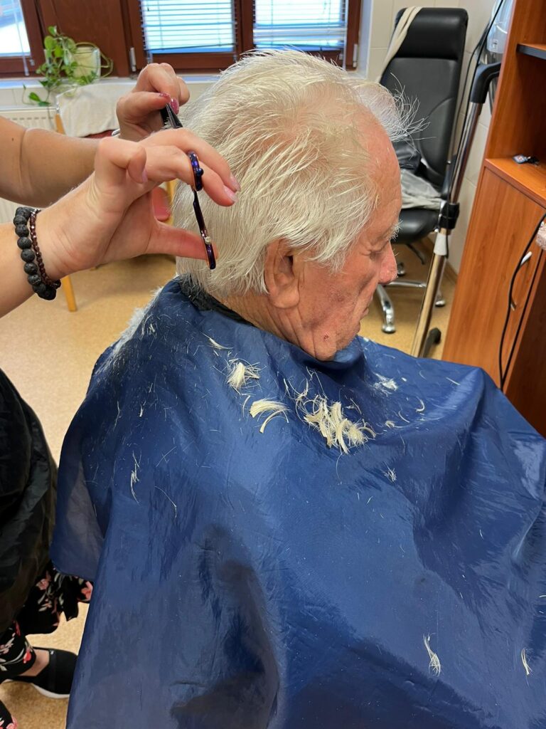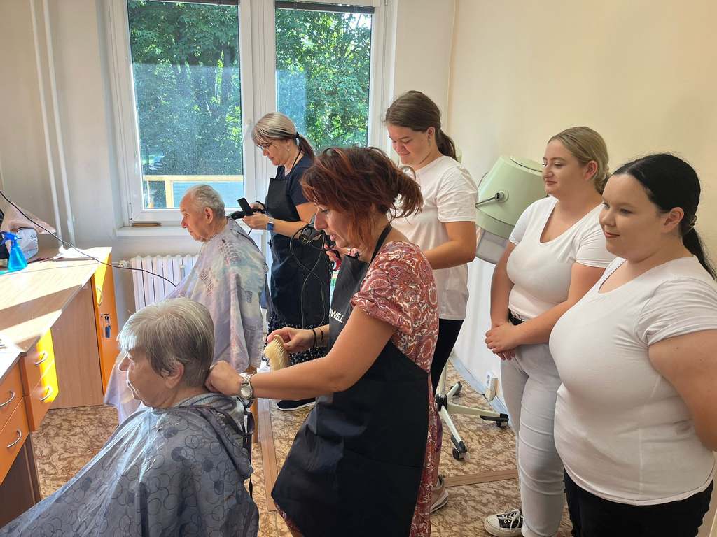 První den výuky odborné praxe žáků oboru Kadeřník SŠ a MŠ Litegra Litoměřice se budoucí kadeřnice věnovaly seniorům, konkrétně z Domova na Dómském pahorku. Na fotografiích jsou žákyně prvního ročníku oboru Kadeřník. Do domovů seniorů v Litoměřicích žákyně a žáci z Litegry s učitelkami odborného výcviku pravidelně docházejí a poskytují kadeřnické služby seniorům. Níže najdete fotografie stejné služby z Domova seniorů U Trati v Litoměřicích (rovněž kadeřnice z prvního ročníku).