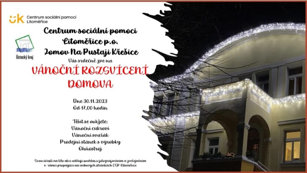 Křešice – Vánoce jsou definitivně tady! ve čtvrtek 30. listopadu v 17 hodin bude slavnostně rozsvícen Domov Na Pustaji v Křešicích. Přijďte se svátečně naladit a podpořit zdejší klienty! Kromě toho, že se rozsvítí zdejší proslulá vánoční výzdoba, kterou Domovu před několika lety nadělila Ježíškova vnoučata, si můžete dát svařák a cukroví.