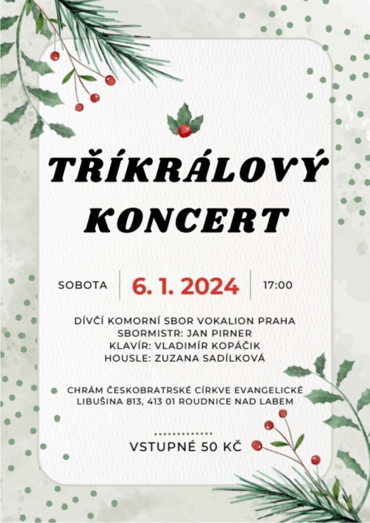 Roudnice nad Labem – Tříkrálový koncert letos bude mít také Roudnice nad Labem. A to už tuto sobotu 6. ledna v 17 hodin. V chrámu Českobratrské církve evangelické (Libušina ul. 813) bude vystupovat sbor Vokalion z Prahy. Vstupné na koncert je 50,- Kč.