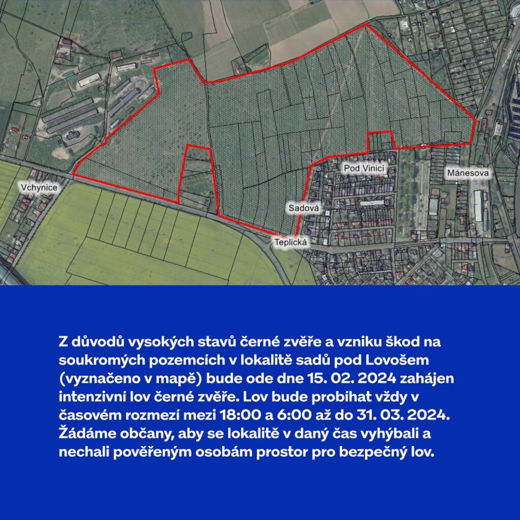 Lovosice – Od 15. 2. až do 31. 3. bude na nehonebních pozemcích města Lovosice probíhat intenzivní odlov černé zvěře – a to vždy od 18 hodin do 6.00 ráno. Lov byl povolen za účelem snížení počtu lokální populace prasete divokého. Provádět ho bude Myslivecký spolek Lovoš.
