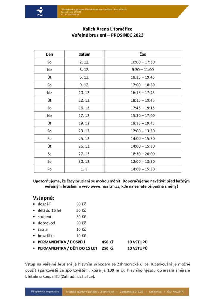 Litoměřice – Nechce se Vám volné vánoční dny trávit jen doma u pohádek a s cukrovím? Zajděte si zabruslit! Veřejné bruslení nabízí Kalich Arena v Litoměřicích. Vyrazit se můžete v sobotu 23. prosince, v pondělí 25. prosince i v úterý 26. prosince. Bruslit se bude dokonce také na Nový rok!