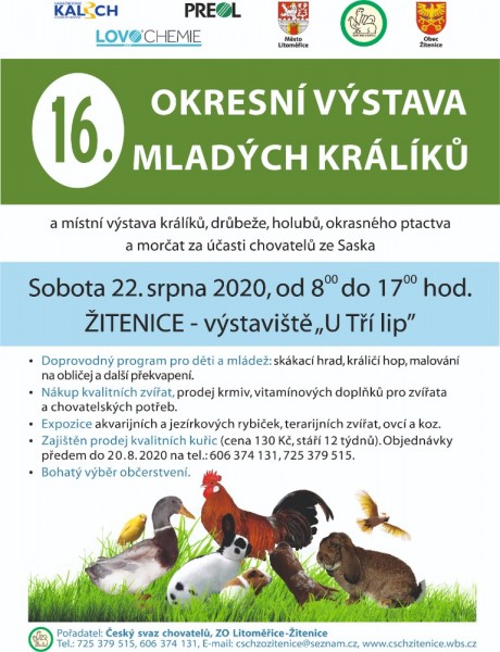 Litoměřice – Svaz chovatelů Litoměřice – Žitenice pořádá tuto sobotu 22. srpna na výstavišti „U Tří lip“ další výstavu zvířátek. Tentokrát budou k vidění králíci, drůbež, holubi, okrasné ptactvo a morčata. Výstava má před sebou už šestnáctý ročník a dorazit na ni můžete s celou rodinou. Probíhat bude od 8 až do 17 hodin.