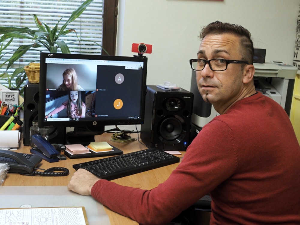 V objektu divadélka Minimax, rovněž v areálu ZUŠ, jsem zastihl Aleše Pařízka, který učí obor literárně dramatický. Obrázek je podobný, prostřednictvím videohovoru právě probíral téma s trojicí studentek – Amálkou, Klárkou a Denisou…