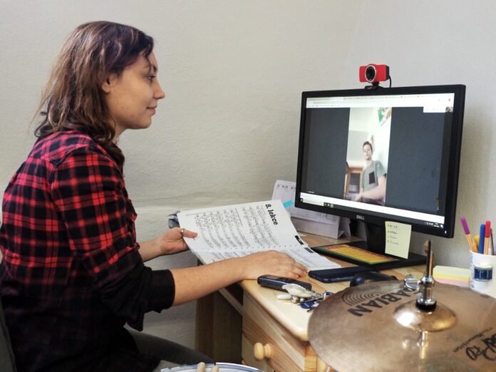 Litoměřice – „Začni od pětky, Matěji. A navážeme na šestku, ano? Úvod na hajtku, pak brejk s crashem, šestnáctiny, synkopa a pokračuje trojka,“ dává pokyny přes monitor Barbora Patáková, učitelka z oddělení bicích nástrojů. Na druhé straně – doma, je vidět a slyšet za bicí soupravou Matěj Škoula, který se na bubny učí pátým rokem. Ve škole, o patro a učebnu dál, se o totéž, samozřejmě on-line, snaží se učitelka hry na klávesy a akordeon Helena Šarochová s Anežkou Malou – nástrojem je keyboard.