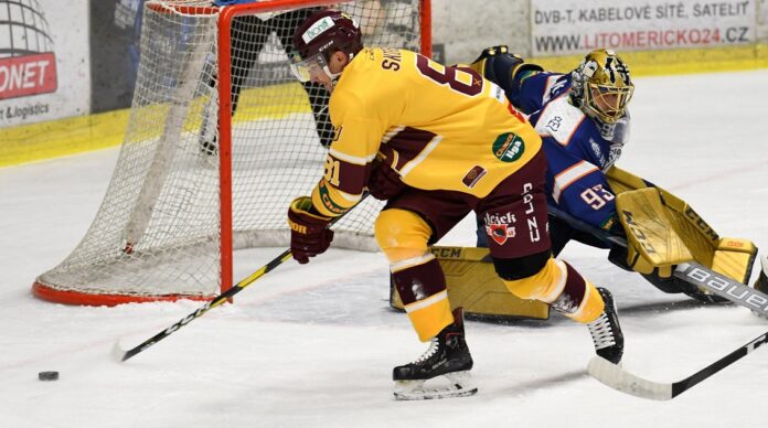 JIHLAVA/LITOMĚŘICE – Stadion nedokázal v Jihlavě navázat na šestizápasovou sérii výher a do Litoměřic žádné body nepřivezl. Dukla už od začátku utkání byla lepším týmem. To jako první potvrdil Tomáš Havránek. Těsně před koncem první třetiny se prosadil i Daniel Kolář. V dalším průběhu hry se dařilo i exkališníkům Strejčkovi se Zadražilem, dvojnásobným střelcem se stal Skořepa. Litoměřickým hráčům se žádnou branku vsítit nepodařilo.