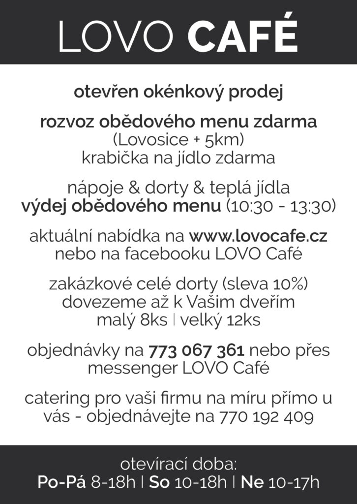 Lovosice – Výdejové okénko kavárny LOVO Café v přízemí Centra kultury Lovoš je stále v provozu. Kromě kávy si tady každý den můžete dát třeba horkou čokoládu nebo vitamínovou vzpruhu v podobě čerstvého zázvorového čaje. Samozřejmostí jsou domácí (každý den čerstvé) dortíky. Ve všední dny Vám tady i uvaří oběd, který po Lovosicích rozvezou zdarma.