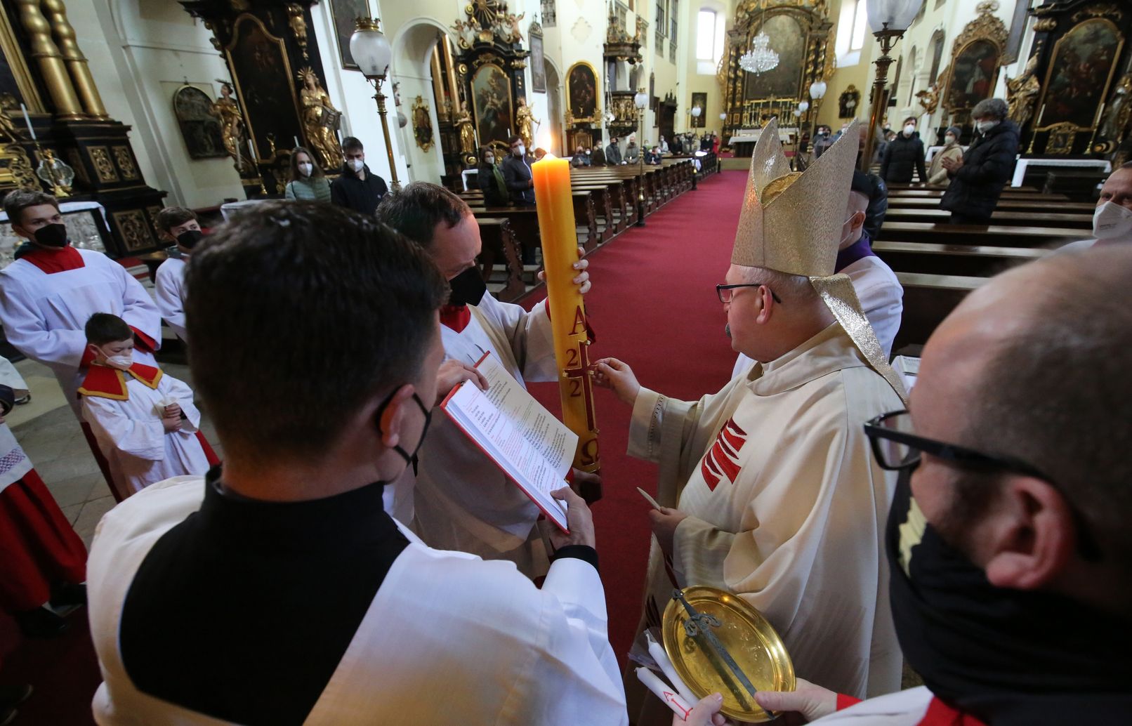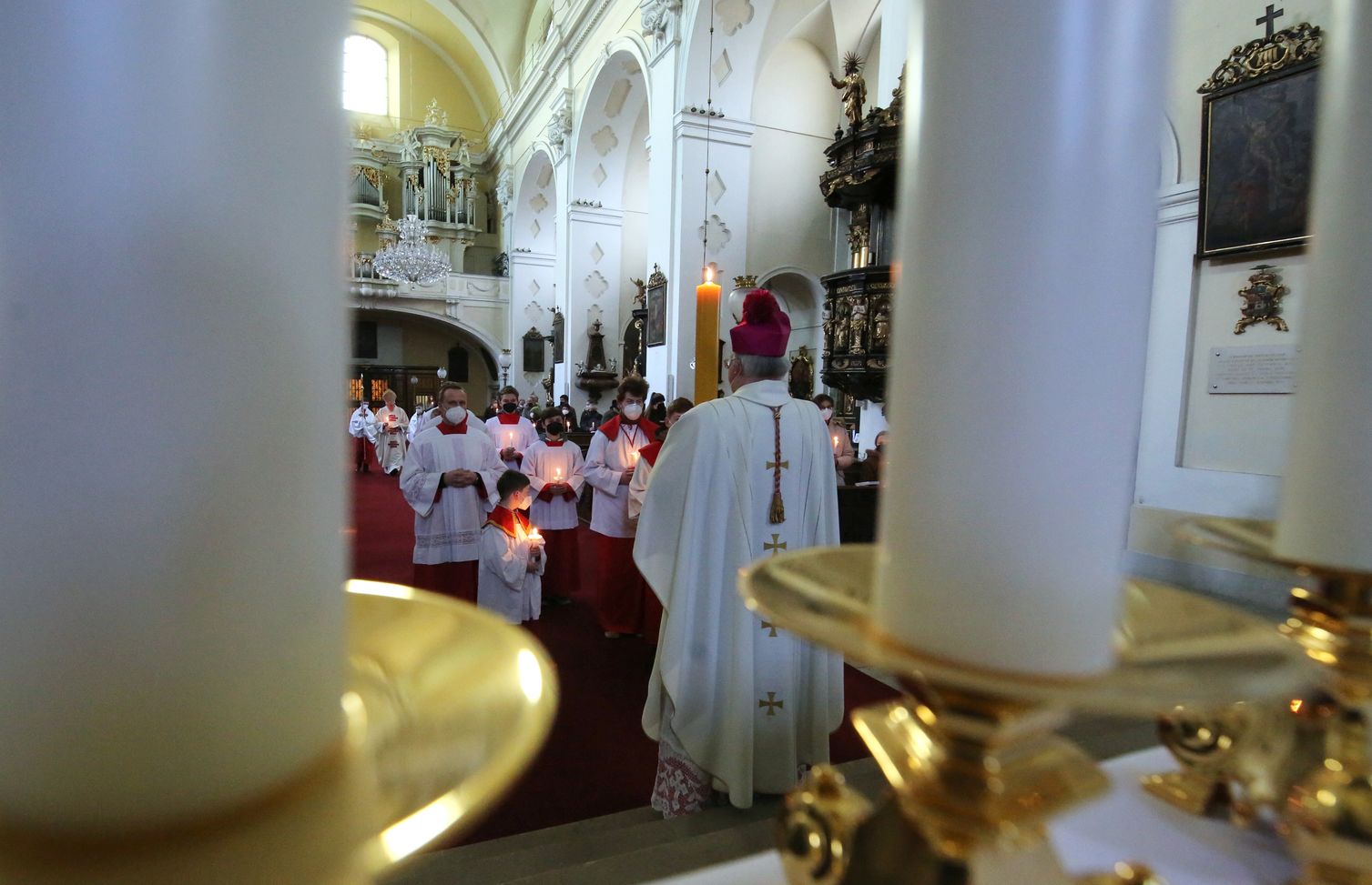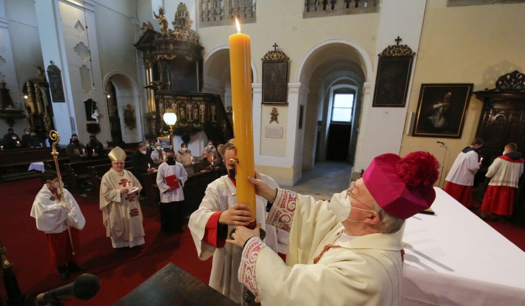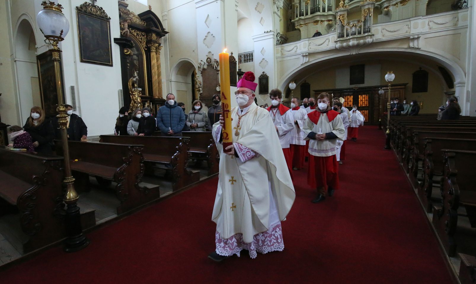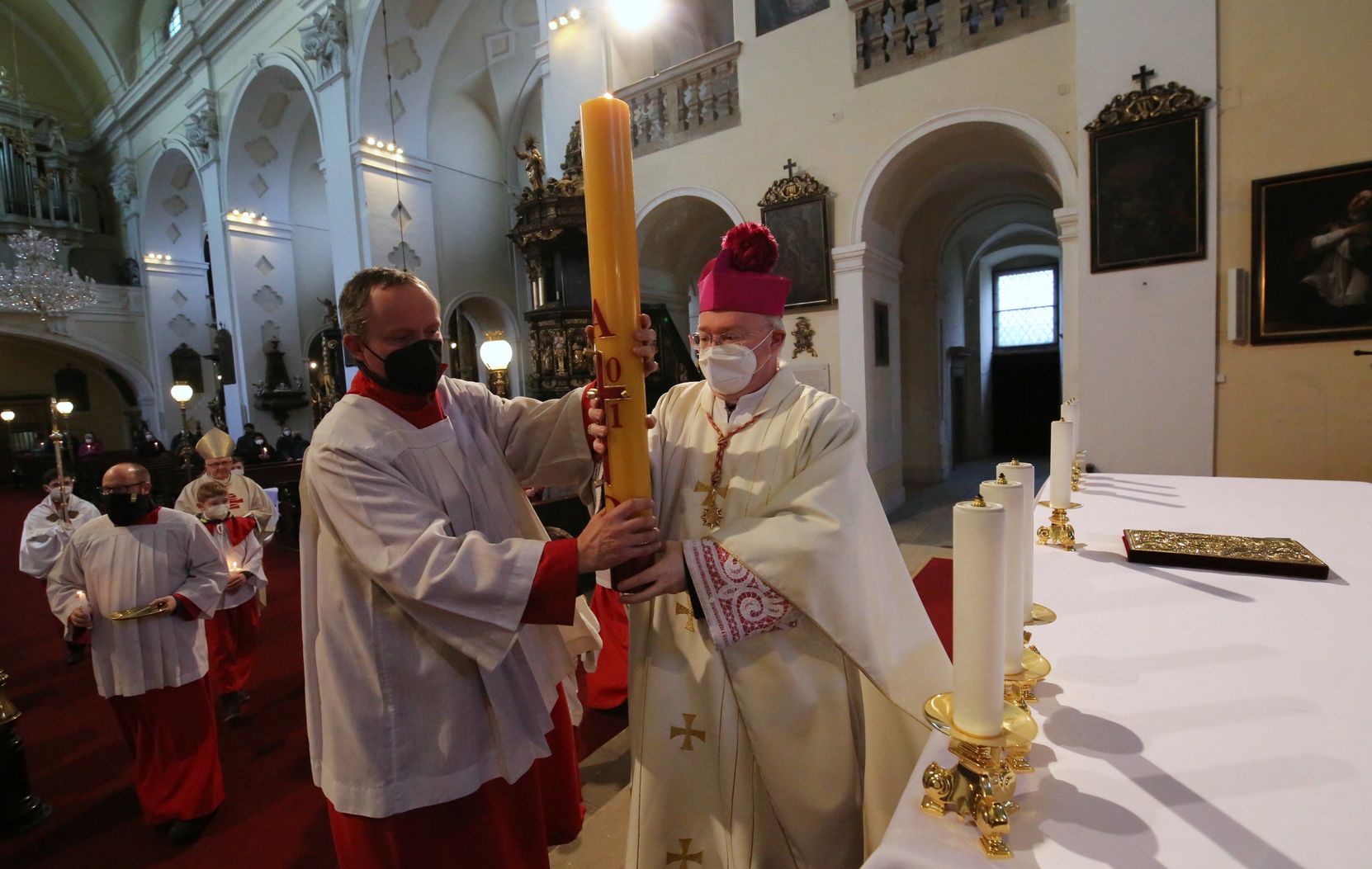LITOMĚŘICE – V katedrále sv. Štěpána v Litoměřicích se na Bílou sobotu 3. dubna večer konaly obřady velikonoční vigilie – bohoslužba světla, slova, vody a oběti. Předsedal jim litoměřický biskup Jan Baxant. Letošní obřady jsou jiné než předešlé roky. Z důvodu koronaviru a vládních nařízení se letos slavnostní obřady Veliké noci, od které mají Velikonoce svůj název, začaly požehnáním ohně v katedrále, od něhož byla poté zapálena velikonoční svíce – paškál. Od jeho plamene si věřící rozžali svoje svíce. Zazněl velikonoční chvalozpěv k posvěcení paškálu zvaný Exsultet, kterým začala bohoslužba slova. Během ní věřící vyslechli devět biblických úryvků.