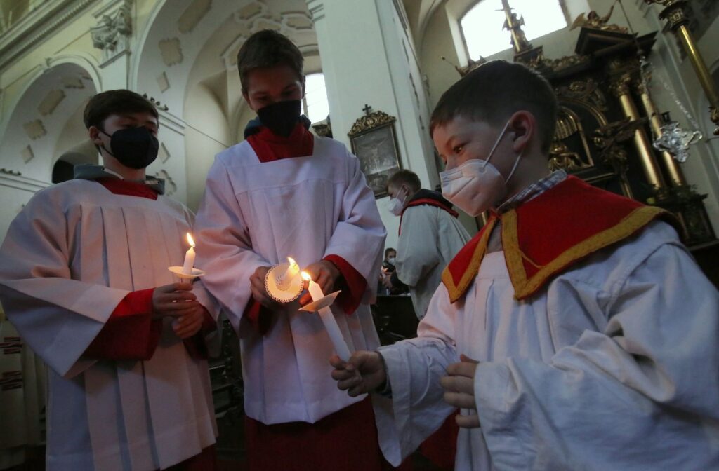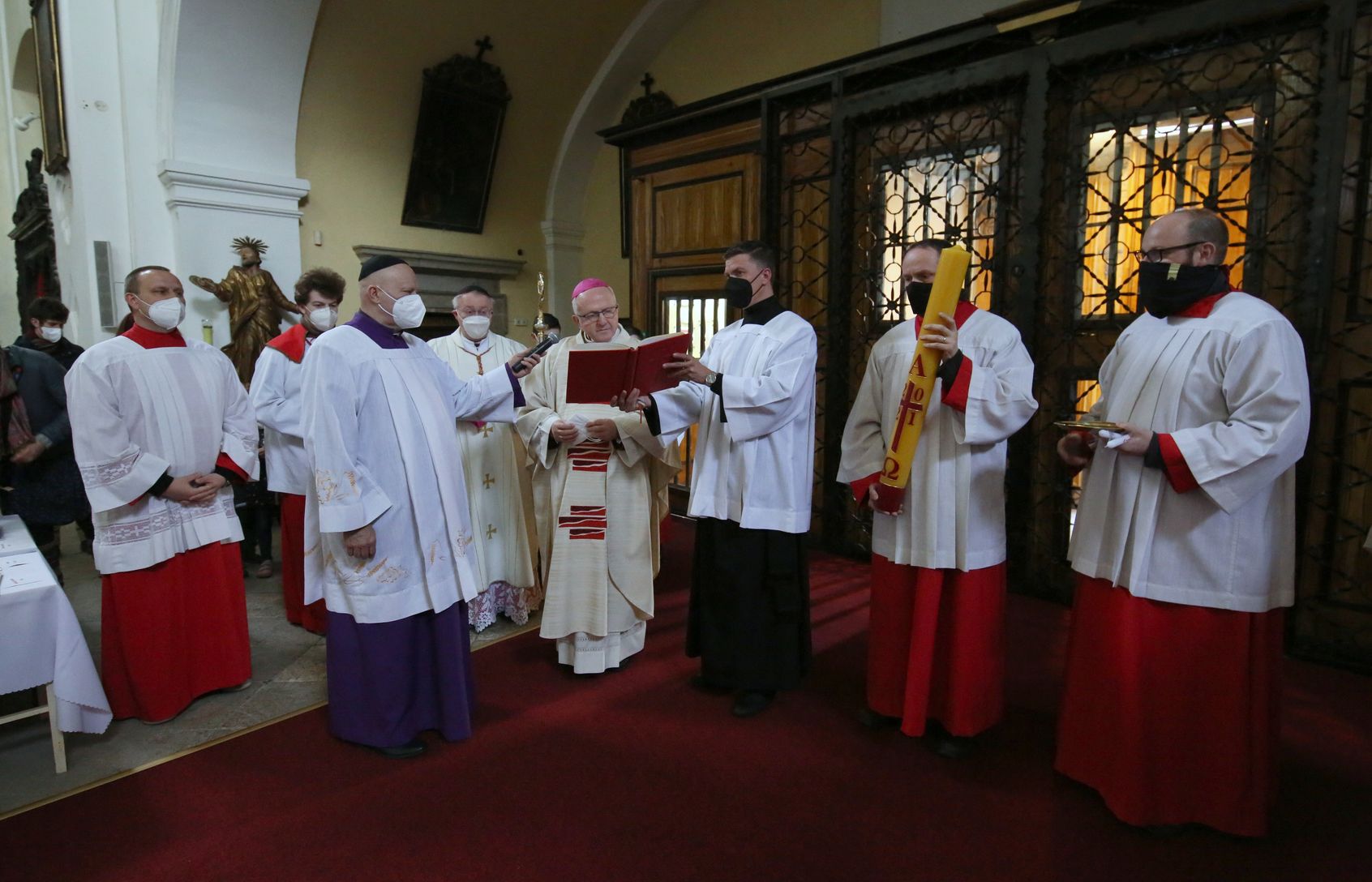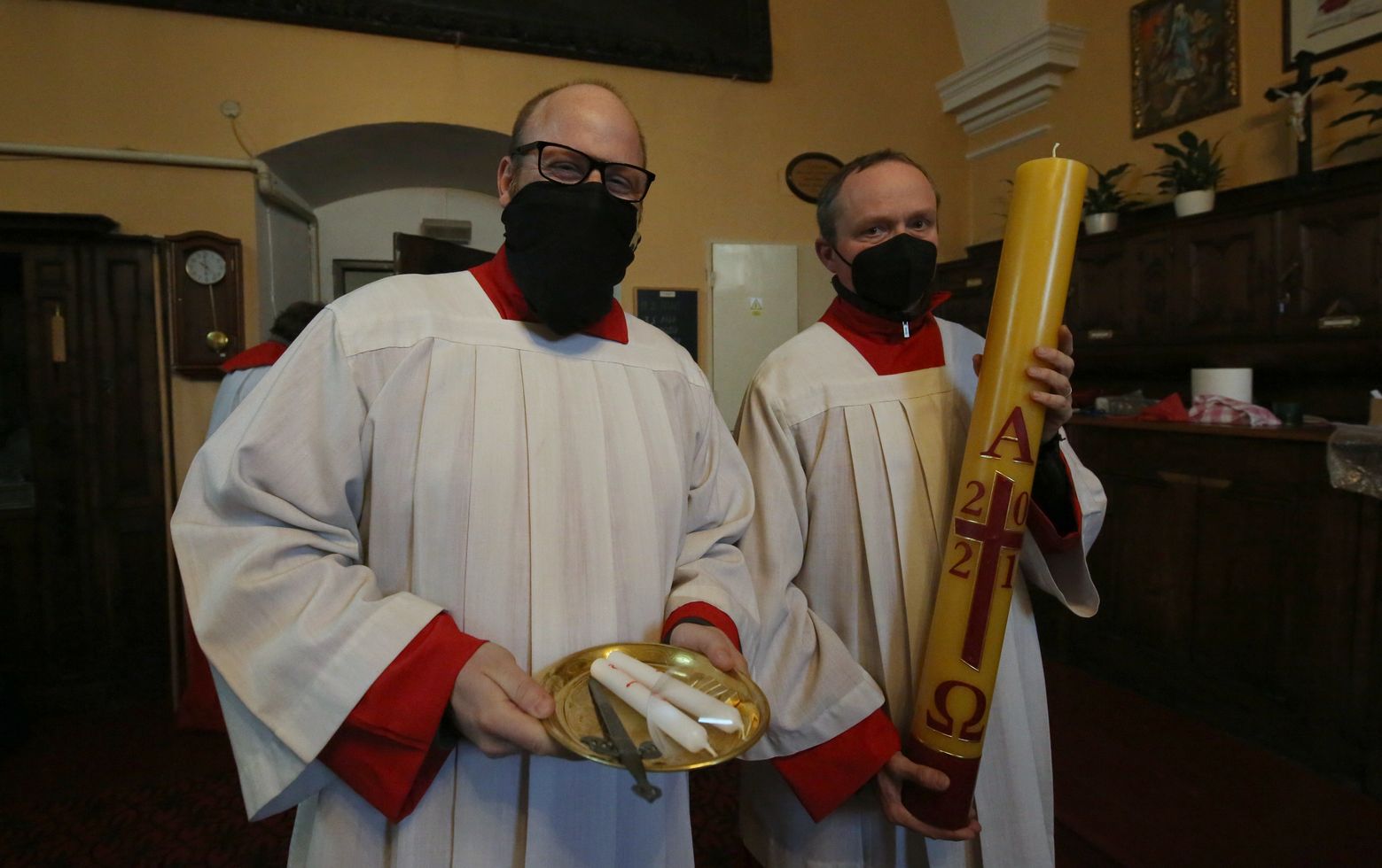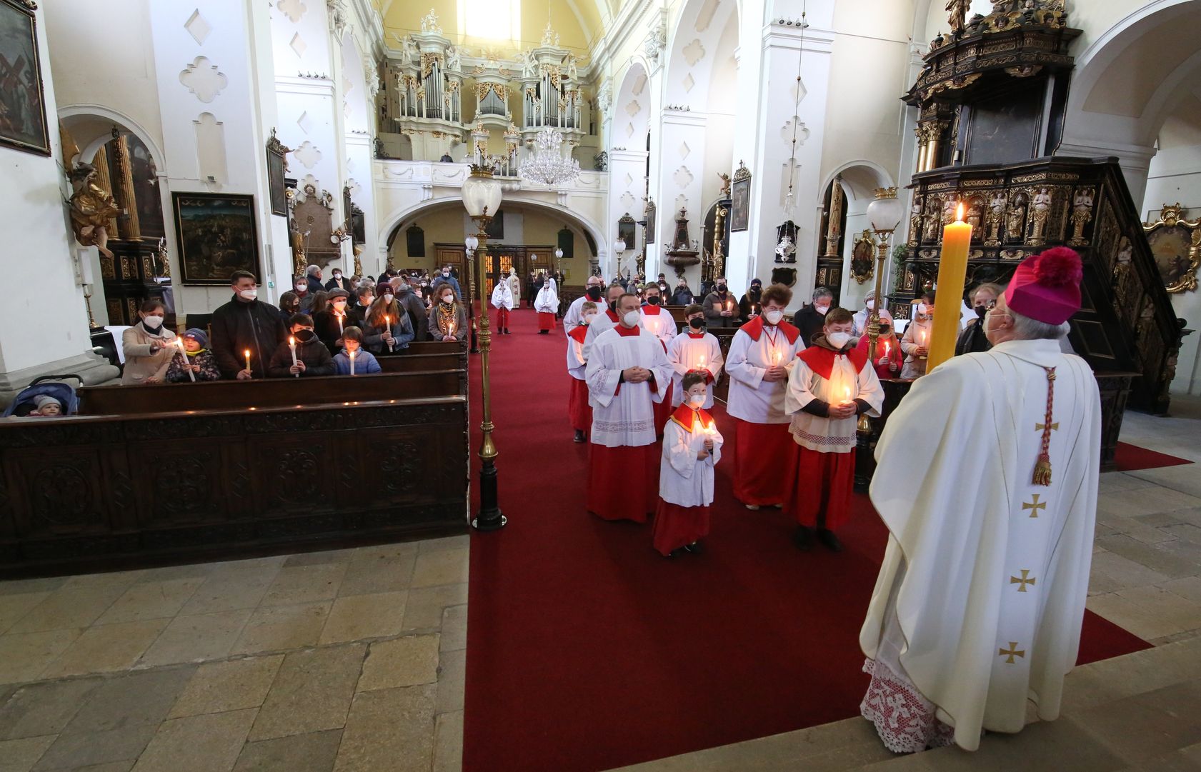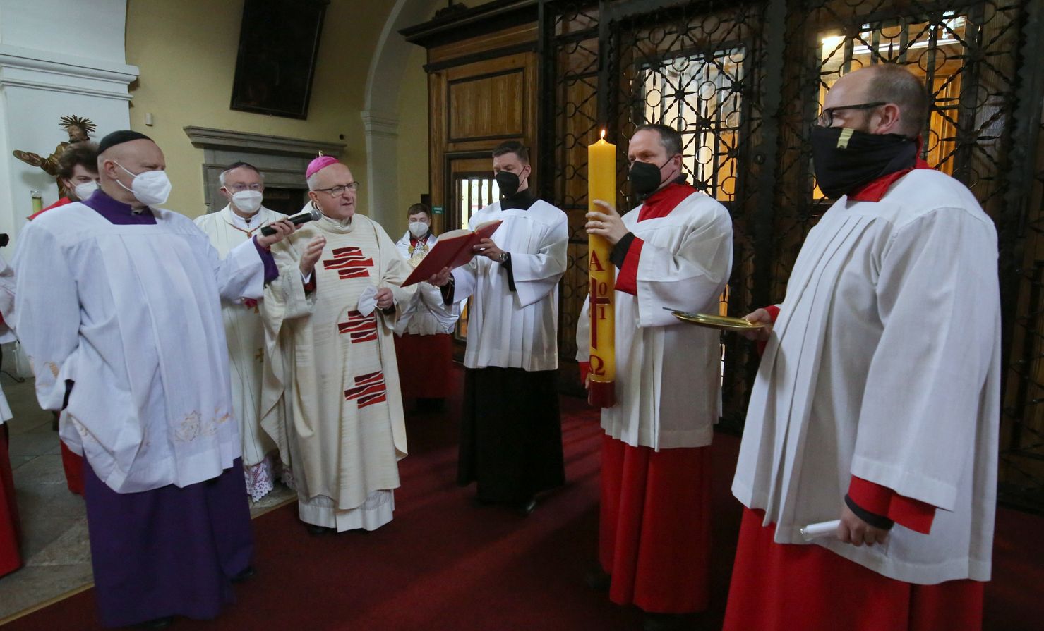 LITOMĚŘICE – V katedrále sv. Štěpána v Litoměřicích se na Bílou sobotu 3. dubna večer konaly obřady velikonoční vigilie – bohoslužba světla, slova, vody a oběti. Předsedal jim litoměřický biskup Jan Baxant. Letošní obřady jsou jiné než předešlé roky. Z důvodu koronaviru a vládních nařízení se letos slavnostní obřady Veliké noci, od které mají Velikonoce svůj název, začaly požehnáním ohně v katedrále, od něhož byla poté zapálena velikonoční svíce – paškál. Od jeho plamene si věřící rozžali svoje svíce. Zazněl velikonoční chvalozpěv k posvěcení paškálu zvaný Exsultet, kterým začala bohoslužba slova. Během ní věřící vyslechli devět biblických úryvků.