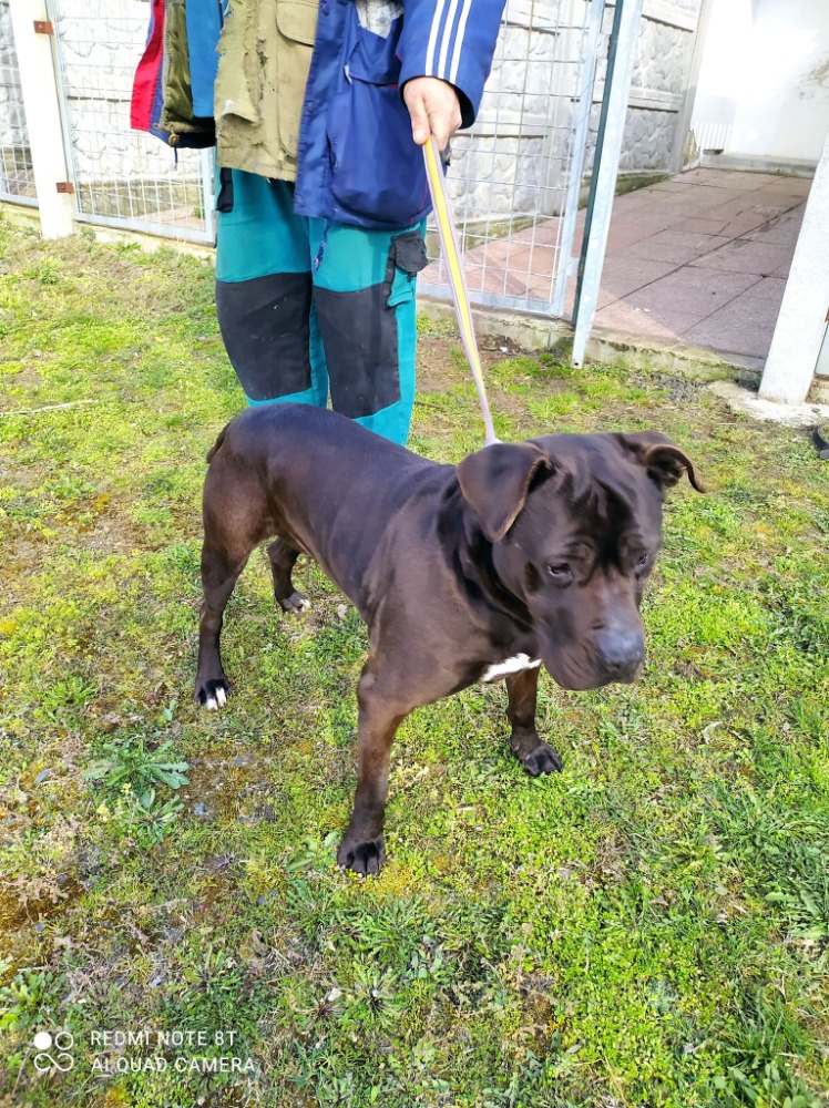 DENY – mladý kříženec staforda, který potřebuje pohyb, procházky a pevnou ruku. Není vhodný k domácím zvířatům. Může být doma v bytě i v zateplené psí boudě. Nejlépe mu bude u člověka, který už má s tímto plemenem zkušenosti. Deny v kohoutku měří 47 cm a při příjmu do útulku vážil 30 kilogramů.