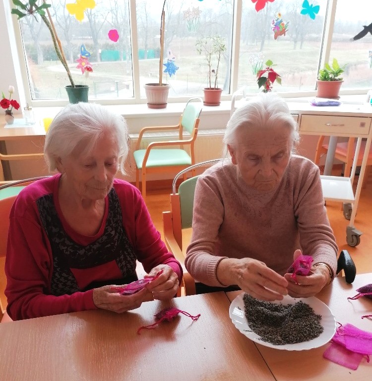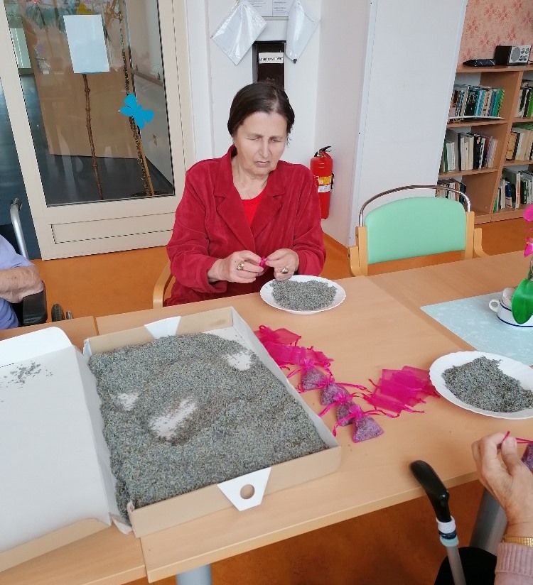 Před pár dny také naši klienti v rámci aktivit na procvičení jemné motoriky vyrobili voňavé sáčky plněné levandulí. Vůně levandule byla cítit pro celém Domově.
