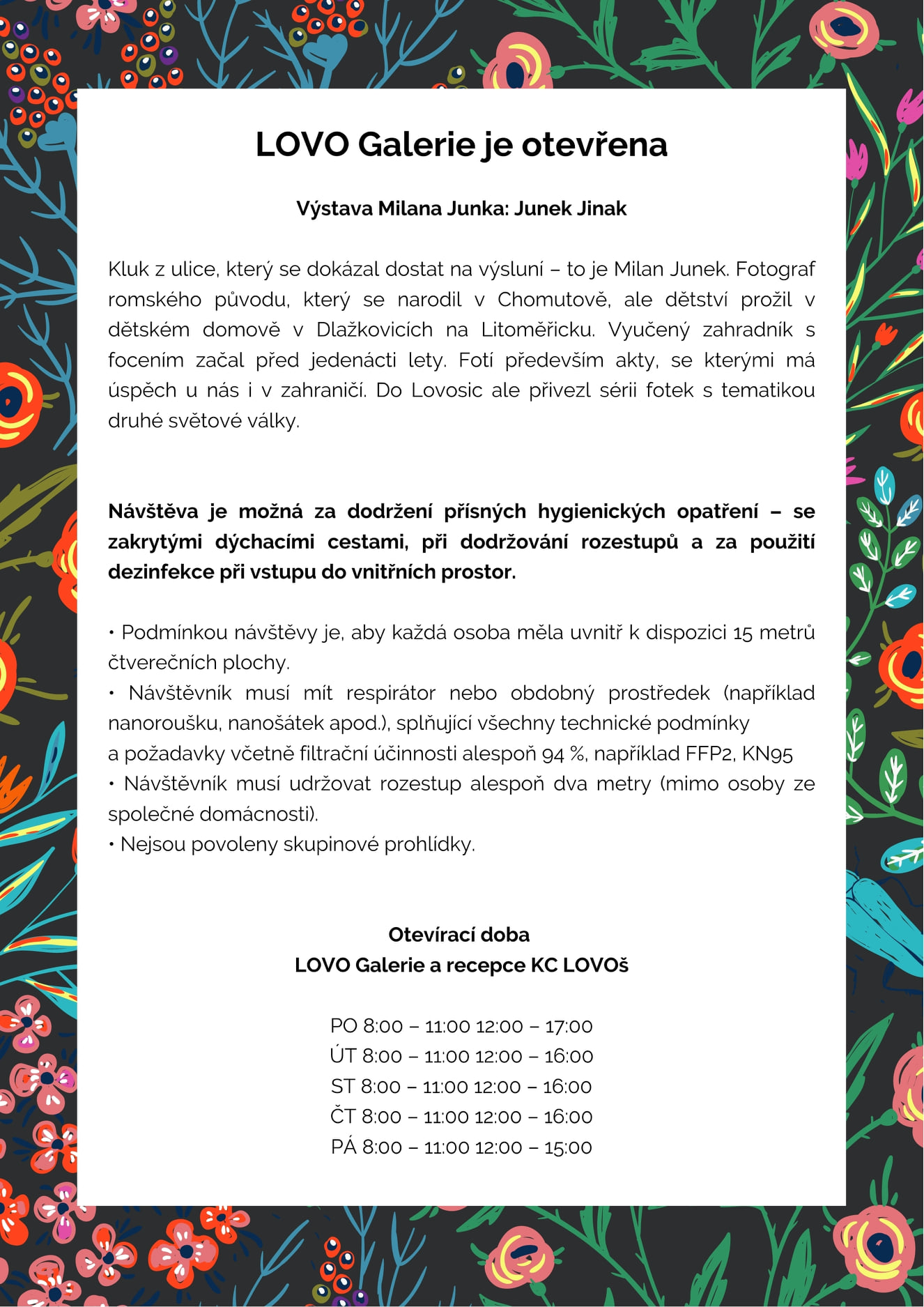Lovosice – Galerie v přízemí Centra kultury Lovoš už je otevřená a čeká na návštěvníky. Přijďte. Stále ještě vystavuje mladý umělec romského původu Milan Junek. Do Lovosic přivezl fotografie s tematikou druhé světové války.
