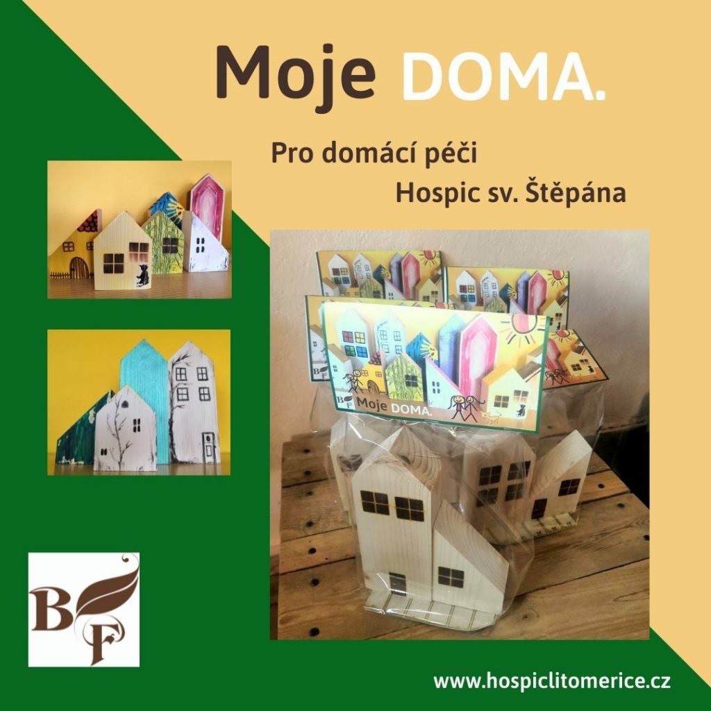 MOJE DOMA – to jsou nové dřevěné domečky, které můžete libovolně domalovat nebo dotvořit, postavit z nich městečko nebo je umístit jednotlivě na parapet. Originální dekorace je ručně vyrobená a 100% výtěžku z jejího prodeje jde na účet hospice. Koupí domečku podpoříte péči o lidi v domácím prostředí.
