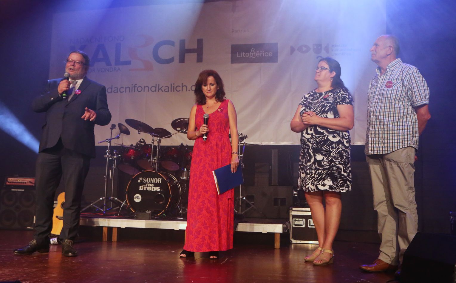 LITOMĚŘICE – Slavné hity legendárních Queen zněly v horkém úterním večeru litoměřickým domem kultury. Při jubilejním desátém Koncertu pro Hospic sv. Štěpána pořádaného Nadačním fondem Kalich Alexandra Vondry se o to postarali zpěvák Vladimír Hron a jeho skupina The Drops. Pro muzikanty to bylo první vystoupení po mnohaměsíční „koronapauze“, na ohromné energii kapely i jejího leadera to však nic neubralo. Moderování večera se opět úspěšně zhostila Eva Břeňová, která ovšem ve fondu Kalich končí. Její roli za město převezme Iveta Holubová. Výtěžek benefičního koncertu je 35600 Kč, šek převzala a lidem poděkovala ředitelka hospice Monika Marková. Zakladatel nadace v závěru večera oznámil, že částku zaokrouhlí na rovných 50 tisíc. Hospic peníze použije na vylepšení svého zázemí, které používají rodiny hospitalizovaných. Koncertu předcházel křest knížky litoměřického fotografa Petra Hermanna „42 zastavení“. Také její prodej půjde ve prospěch hospice, autor mu totiž věnoval část nákladu této obrazové publikace. Hospicové zařízení v Litoměřicích slouží nevyléčitelně nemocným a jejich blízkým už 20 let !