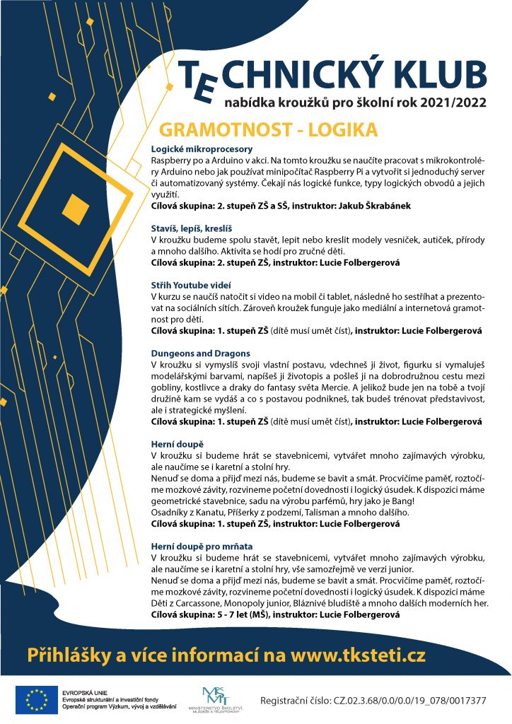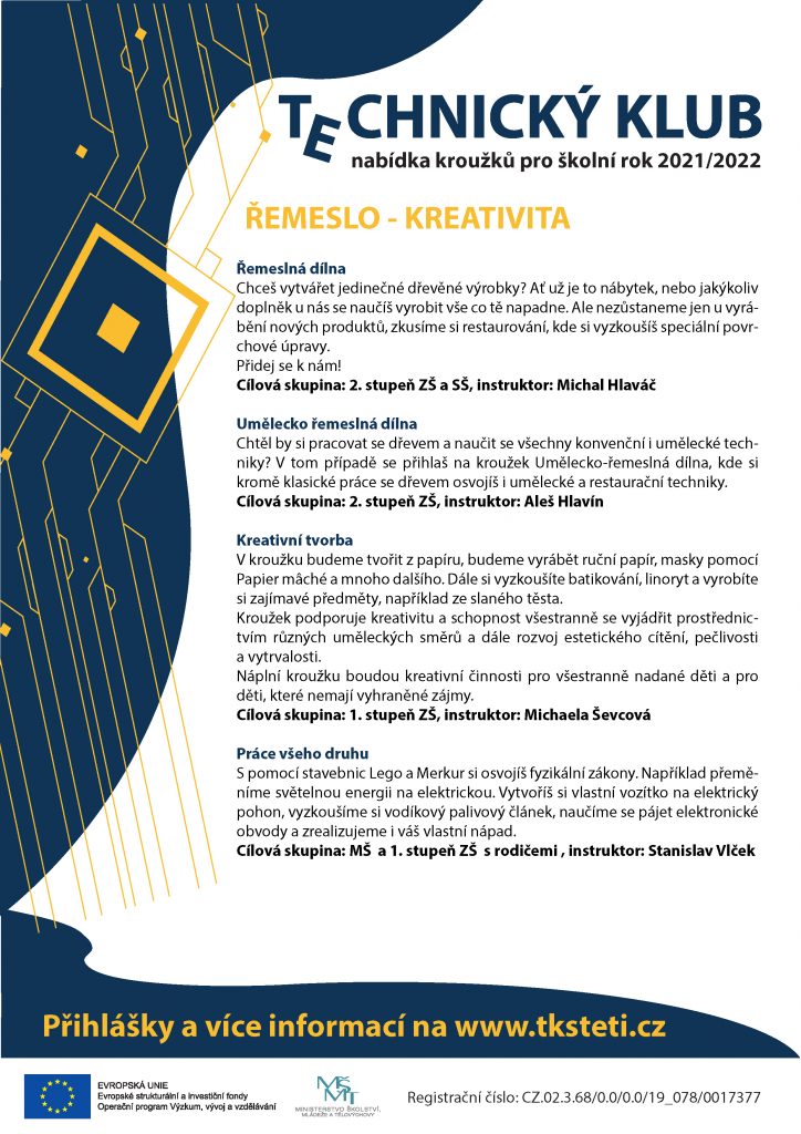 Štětí – Nabídka kroužků Technického klubu Štětí pro školní rok 2021/2022 je k zobrazení na novém webu. Nyní už je zprovozněný web a tam si budou moci zájemci oficiálně podat přihlášku. Všechny kroužky budou i v tomto roce zcela zdarma a otevřou se, pokud se naplní kapacita. Probíhat budou na 3. ZŠ Ostrovní (vstup hlavním vchodem) a na VOŠ obalové techniky a SŠ, Štětí (1. Máje 661). Všechny informace budou na našem webu www.tksteti.cz