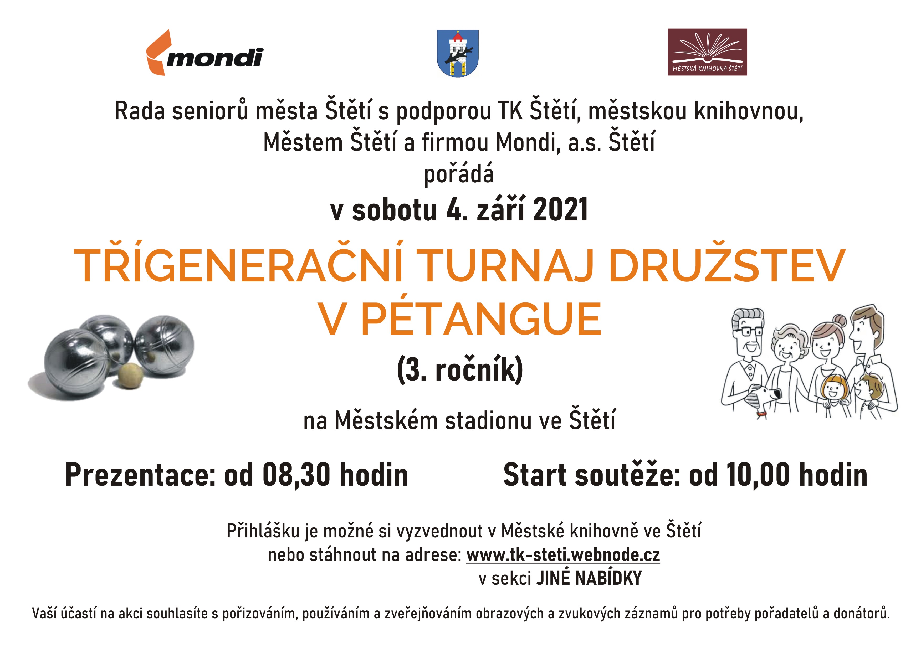 Štětí – Městský stadion bude, 4. září, patřit družstvům pétanqu. Jedná se o 3. ročník Tří generačního turnaje o pohár starosty města v pétangue, který pořádal Turistický klub Štětí za podpory rady Seniorů a společnosti Mondi Štětí. Přihlášku je však nutné podat do 27. srpna! V listinné podobě může přihlášku vyzvednout v Městské knihovně Štětí nebo elektronicky stáhnout na https://tk-steti.webnode.cz/ v sekci Jiné nabídky.