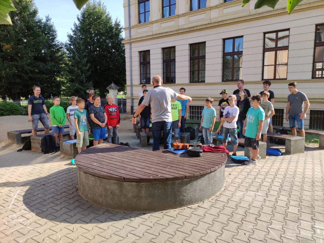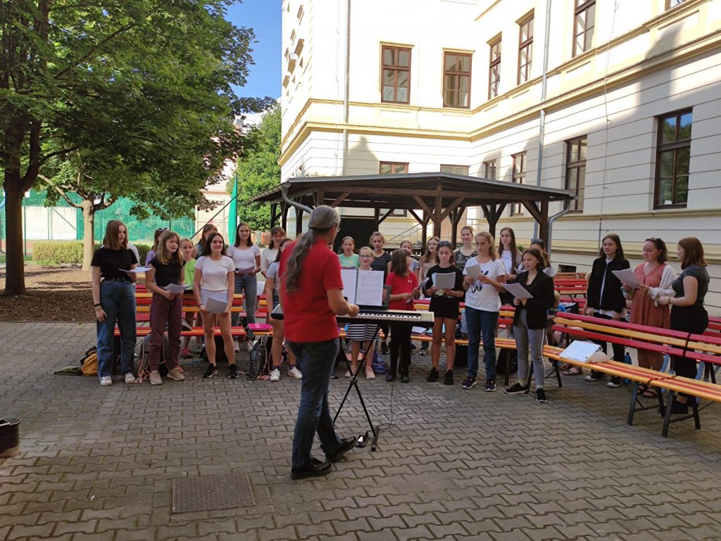 První zkoušky sborů proběhly ve venkovním areálu školy. Pokud počasí dá, budou ho využívat i nadále.