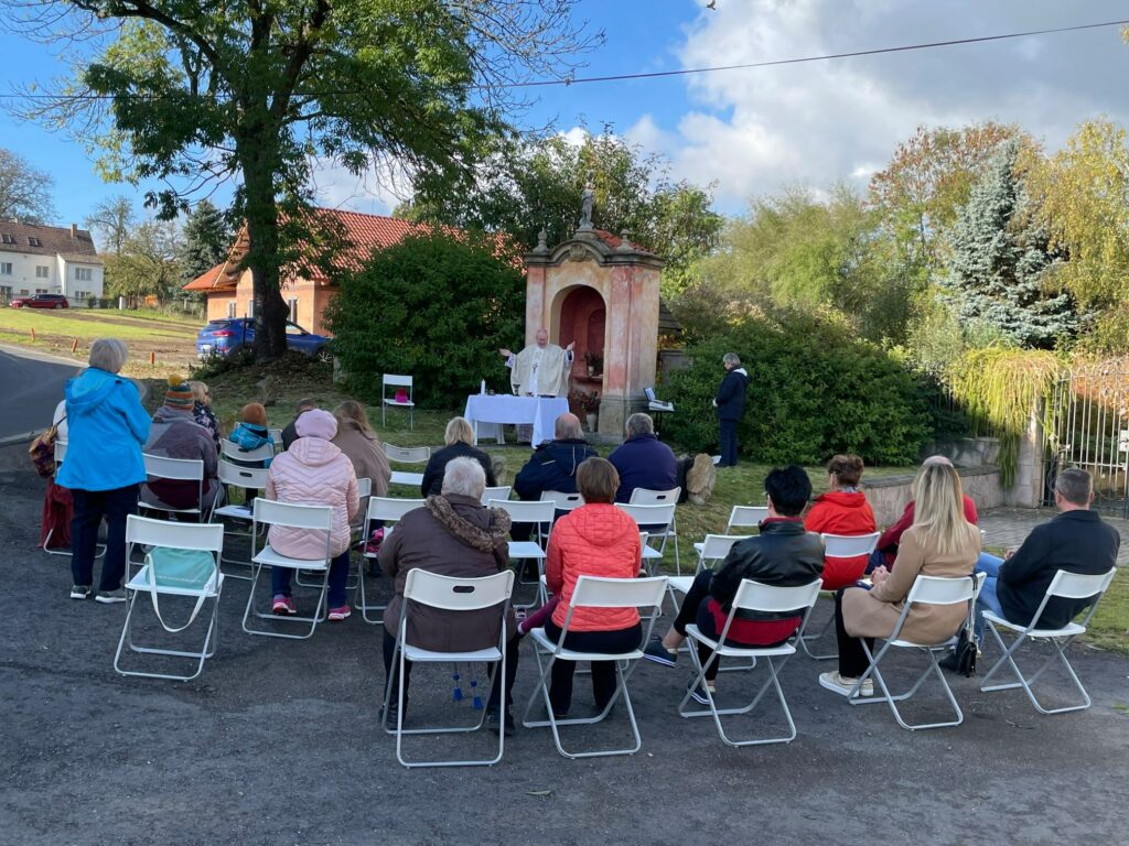 Býčkovice – V sobotu 16. října 2021 od 10 hodin se konala v Býčkovicích u Litoměřic svatohavelská pouť. Protože místní kostel byl zbořen v roce 1965, sloužil poutní mši svatou generální vikář Mons. Martin Davídek u výklenkové kapličky, která se nachází ve středu obce.