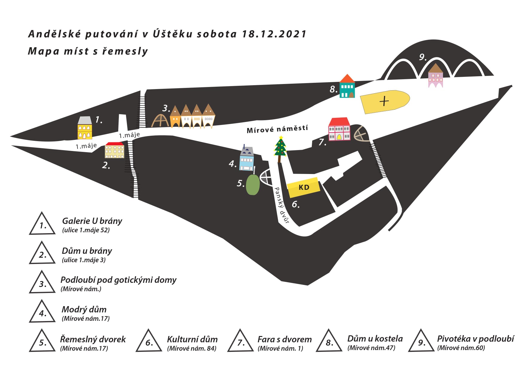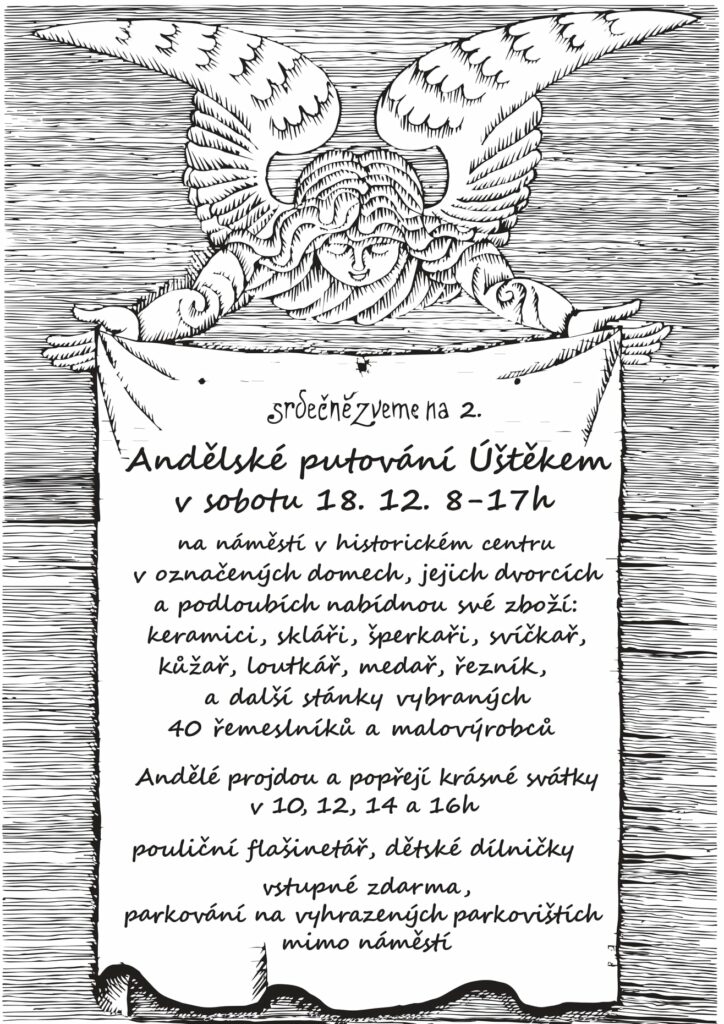 Úštěk – Úštěckému adventu současná nařízení vlády opět nepřejí, a tak ve městě bude tuto sobotu alespoň komorní „Andělské putování.“ Ve vybraných historických objektech na náměstí (nebo na jejich dvorcích či v podloubích) vystaví své zboží celá řada řemeslníků. Přijďte v sobotu 18. prosince podpořit jejich um a nadání  a udělejte radost sobě i svým blízkým.