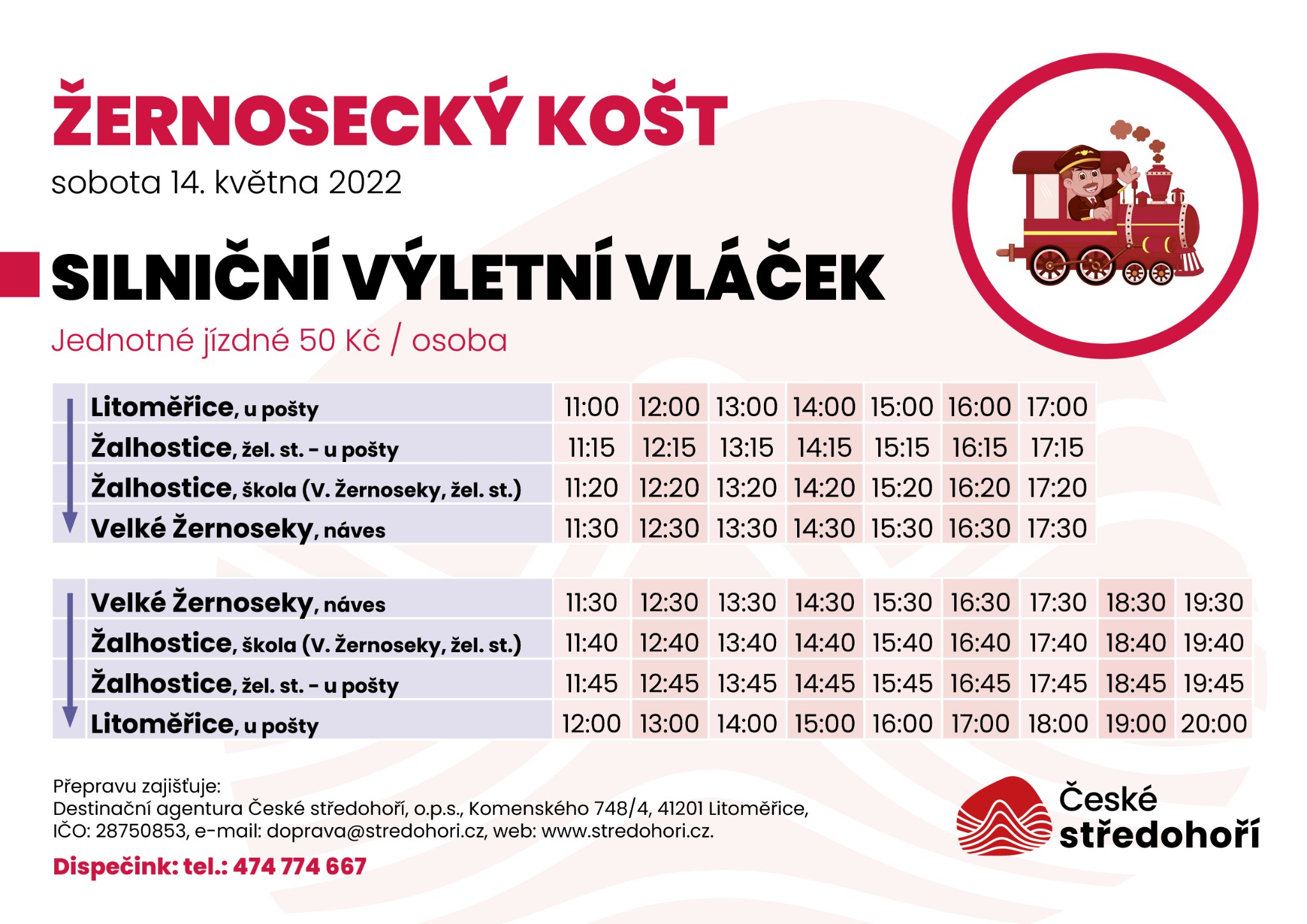 Auta nechte doma! Z Litoměřic bude do Velkých Žernosek (a zpět) jezdit výletní vláček – jízdné 50,- Kč osoba. Od 11 do 20 hodin bude v provozu také žernosecký přívoz, který bude přepravovat návštěvníky dle potřeby.