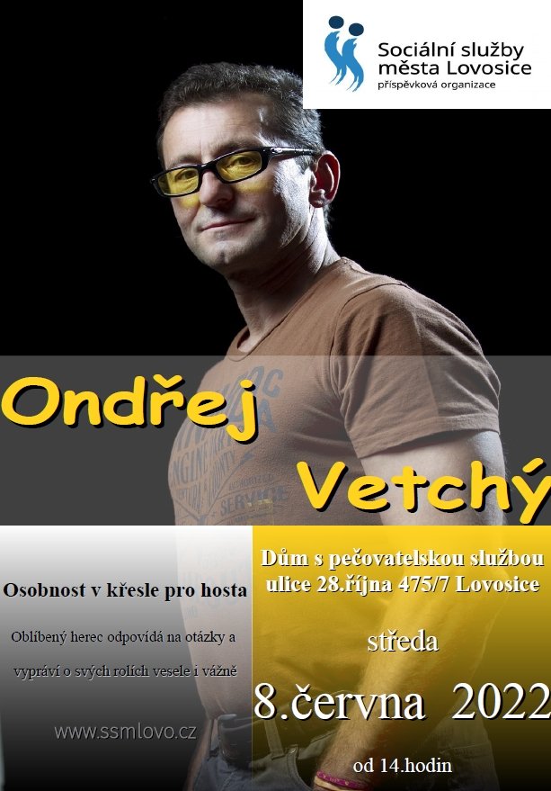 Lovosice – Lovosický Dům s pečovatelskou službou bude ve středu 8. června hostit vzácnou návštěvu. Na besedu sem totiž přijede oblíbený herec Ondřej Vetchý. V rámci zdejšího cyklu „Křeslo pro hosta“ ho můžete vyzpovídat od 14 hodin. Akce je i pro širokou veřejnost!