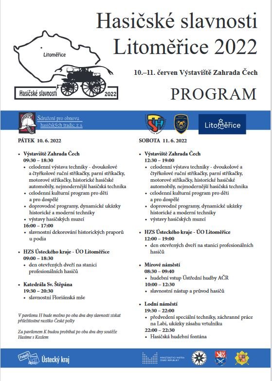 Litoměřice – Litoměřice již tradičně přivítají největší celorepublikový sraz hasičstva s nejrozsáhlejší výstavou hasičské techniky. Jedná se již o 8. ročník a proběhne ve dnech 10. – 11. června 2022 Ten, kdo v těchto dnech zavítá na výstaviště Zahrada Čech, na Mírové náměstí a posléze na Lodní náměstí, se může těšit na hasičskou techniku od té nejstarší, ze sbírek sborů dobrovolných hasičů, až po tu nejmodernější a speciální, kterou disponuje Hasičský záchranný sbor ČR.