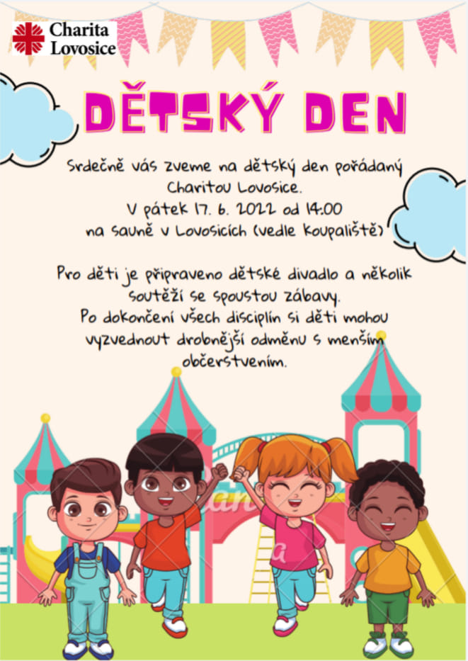 Lovosice – Dětský den pořádá s drobným zpožděním také lovosická charita. A to už tento pátek 17. června ve 14 hodin. Akce se koná u restaurace Sauna – vedle koupaliště.