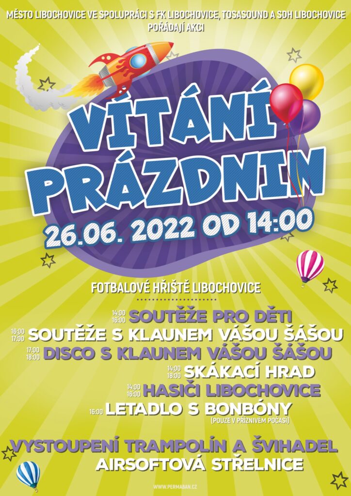 Libochovice – Přijďte tuto neděli 26. června přivítat prázdniny do Libochovic! Odpoledne s atrakcemi a zábavou pro celou rodinu bude probíhat od 14 hodin na zdejším fotbalovém hřišti. Pokud bude příznivé počasí, v 16 hodin budou z nebe padat bonbóny!