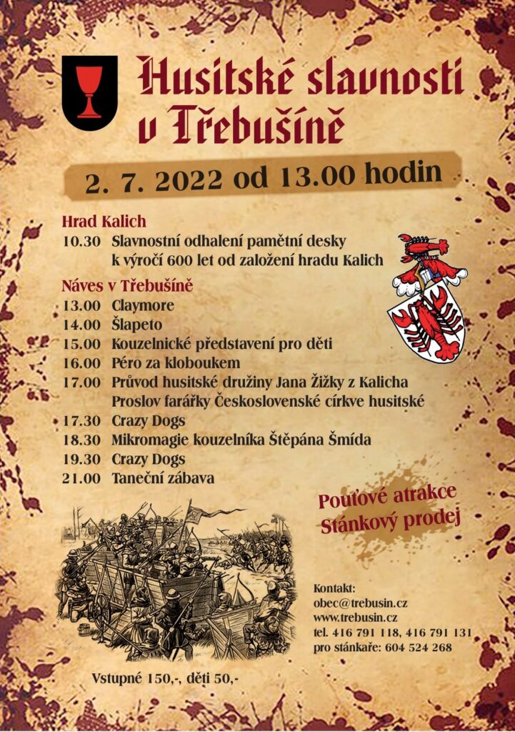 Třebušín – Vraťte na jedno odpoledne do patnáctého století a užijte si tuto sobotu 2. června HUSITSKÉ SLAVNOSTI, které se konají v Třebušíně na návsi. Bohatý program s hudbou a stánky startuje ve 13 hodin.