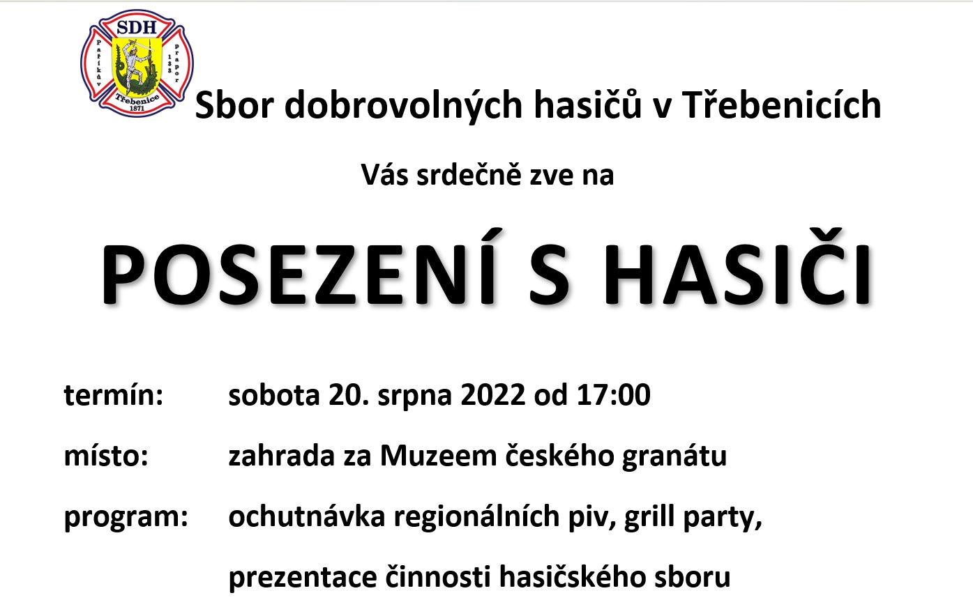 Třebenice – Sbor dobrovolných hasičů Třebenice pořádá tuto sobotu 20. srpna venkovní posezení pro všechny příznivce dobrého jídla, piva a hlavně hasičů. Akce začíná v 17 hodin, vše bude probíhat v zahradě Muzea českého granátu.
