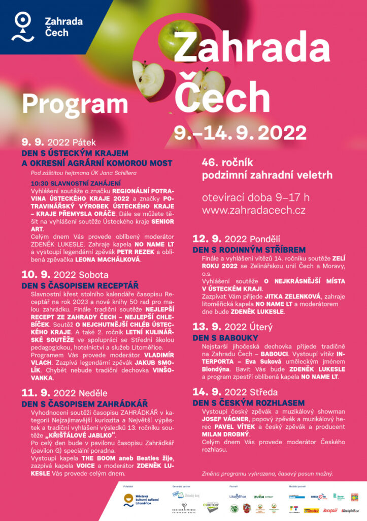 Ty nejkrásnější výpěstky, ukázkové expozice, zajímavé inspirace. První den veletrhu patří Ústeckému kraji a Okresní agrární komoře Most. Proběhne slavnostní zahájení a bude vyhlášena Regionální potravina Ústeckého kraje 2022 a Potravinářský výrobek Ústeckého kraje – kraje Přemysla Oráče. Ve spolupráci s časopisem Receptář se v sobotu dozvíme, kdo získá cenu o nejlepší recept Zahrady Čech – nejlepší chlebíček. Proběhne také soutěž o nejchutnější chléb Ústeckého kraje. Neděle, neboli den s časopisem Zahrádkář, odhalí výsledky soutěží Nejzajímavější kuriozita a Největší výpěstek. Proběhne taktéž tradiční vyhlášení výsledků 13. ročníku soutěže „KŘIŠŤÁLOVÉ JABLKO“.