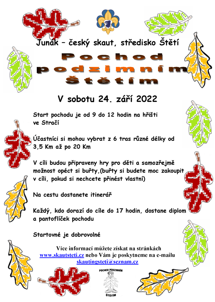 V sobotu 24. 9. 2022 SKAUTSKÉ STŘEDISKO ŠTĚTÍ Vás zve na Pochod podzimním Štětím. Od 9:00 – 12:00 hodin start na hřišti ve Stračí, 6 tras různé délky od 3,5 km až po 20 km.