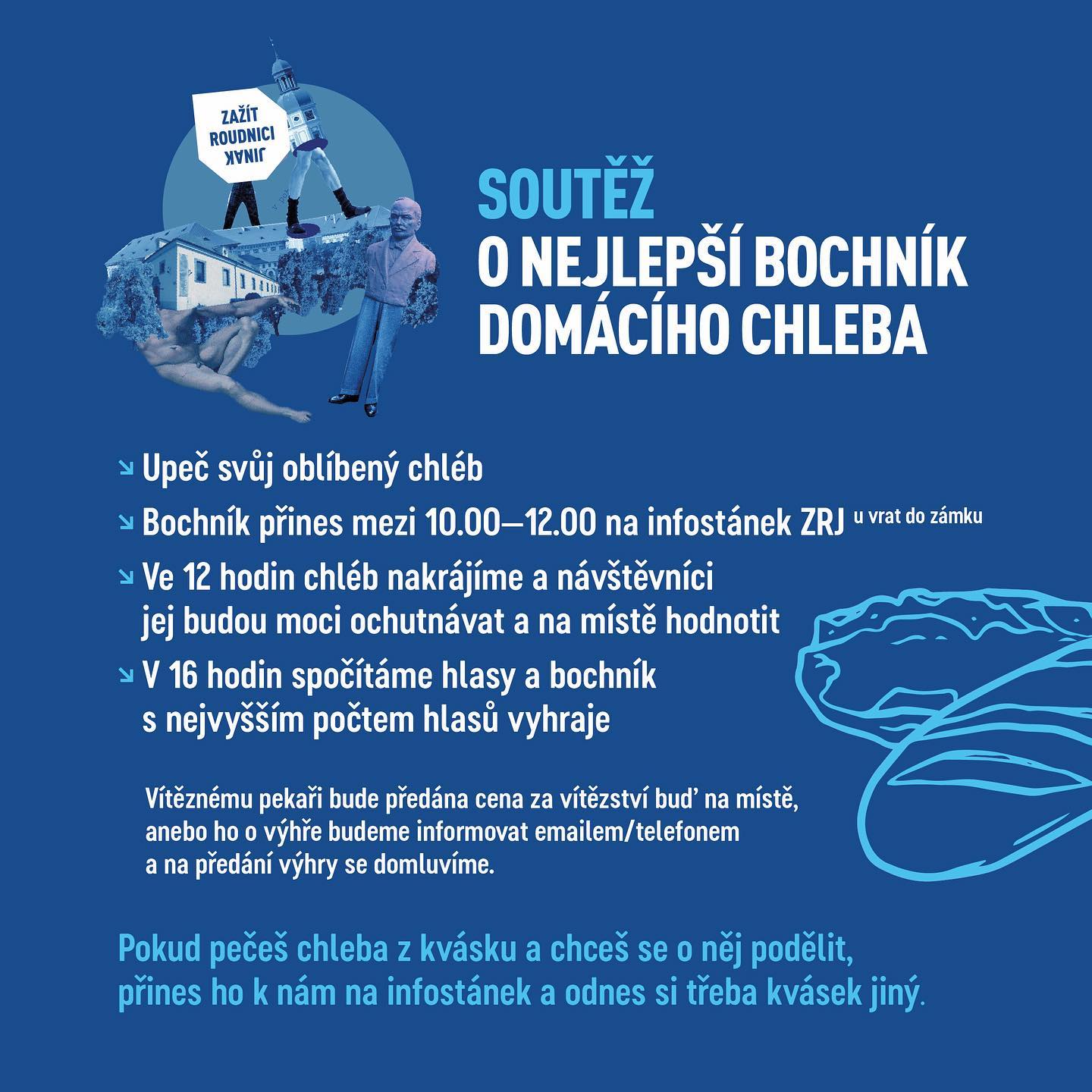Chcete se soutěže zúčastnit? Upečte svůj oblíbený chleba a přineste ho v sobotu mezi 10 a 12. hodinou na infostánek akce Zažít Roudnici jinak. Ve 12 hodin budou soutěžní chleby nakrájeny a návštěvníci je budou moci ochutnat a na místě ohodnotit.