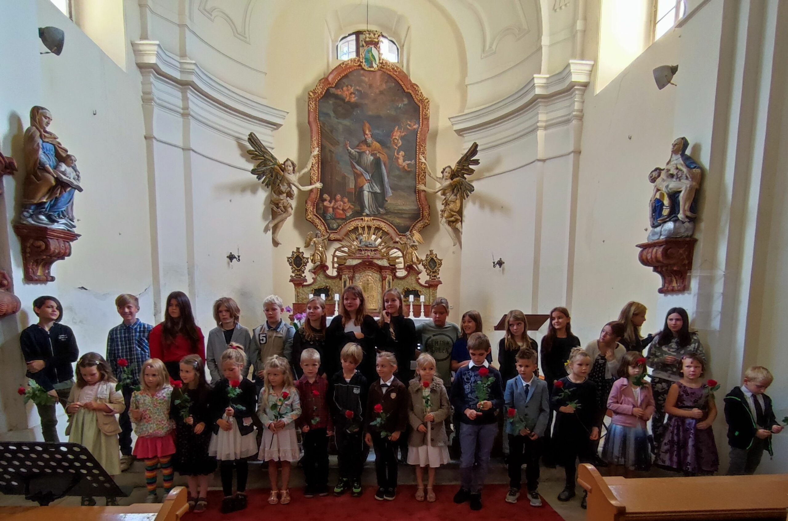 Třebušín – Slavnostní zahájení školního roku proběhlo již tradičně v kostele svatého Mikuláše v Třebušíně. Patnáct prvňáčků přivítala nejen nově zvolená paní ředitelka Kristýna Brabcová, ale také starostka Třebušína paní Dana Legnerová a třídní učitelka Věra Dvořáková.