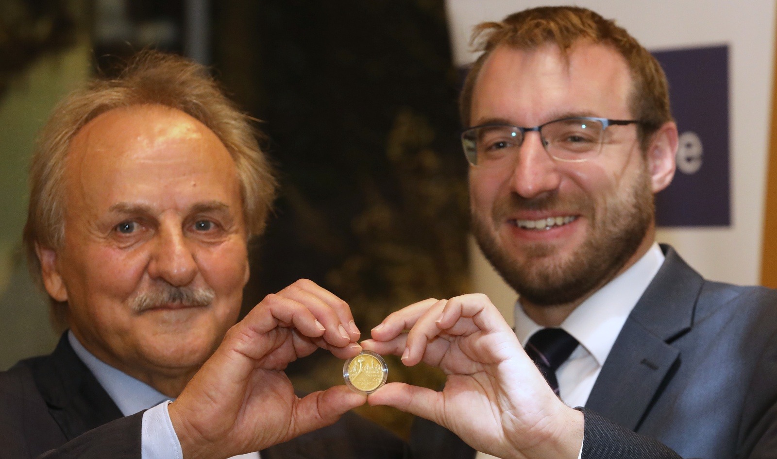 Litoměřice – Věž Kalich, stará radnice (dnes sídlo Oblastního muzea) i věž kostela Všech svatých. Tyto unikátní stavby jsou vyobrazeny na zlaté minci, kterou právě dnes předal guvernér České národní banky Aleš Michl starostovi Litoměřic Ladislavu Chlupáčovi.