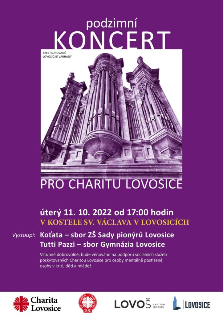 Lovosice – Víte, že v úterý 11. října se v kostele sv. Václava koná Podzimní koncert pro Charitu Lovosice? Zpívat bude sbor Koťata z lovosické ZŠ Sady Pionýrů a sbor Tutti Pazzi z místního gymnázia. Koncert začíná v 17 hodin a celý výtěžek z dobrovolného vstupného půjde na dobrou věc.