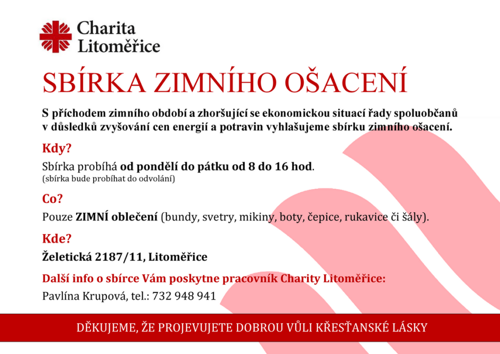 Litoměřice – Až do odvolání přijímá Charita Litoměřice zimní ošacení – bundy, svetry, mikiny, boty, čepice, rukavice, šály a teplé ponožky. Sbírka probíhá do odvolání.