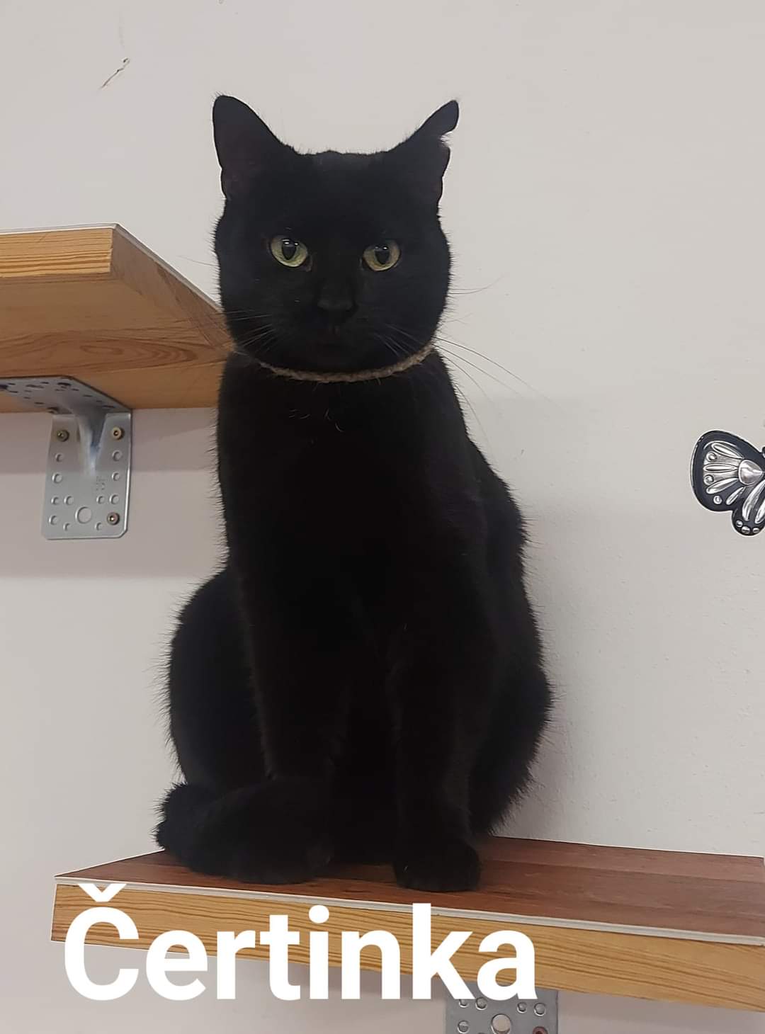 Čertinka z Litoměřic od Labe, milá černá nenápadná kočička. Která tu trošku zapadá mezi ostatními, přitom je milá, hraje si, zvyknutá na kočičky i pejska.