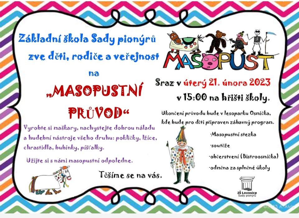 Lovosice – Lovosická Základní škola Sady Pionýrů pořádá v úterý 21. února MASOPUSTNÍ PRŮVOD pro širokou veřejnost. Masky, dobrou náladu a hudební nástroje všeho druhu (pokličky, lžíce, chrastidla, bubínky i píšťalky) s sebou! Sraz v 15 hodin na hřišti školy.