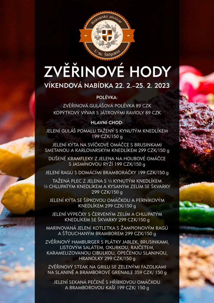 Litoměřice – Od dnešního dne až do soboty 25. února si můžete v Biskupském pivovaru v Litoměřicích užít Zvěřinové hody. Na výběr je celkem jedenáct hlavních jídel a dvě polévky, takže na své si přijdou i ti nejnáročnější strávníci. Rezervaci stolu můžete provést na telefonním čísle 703 379 302.