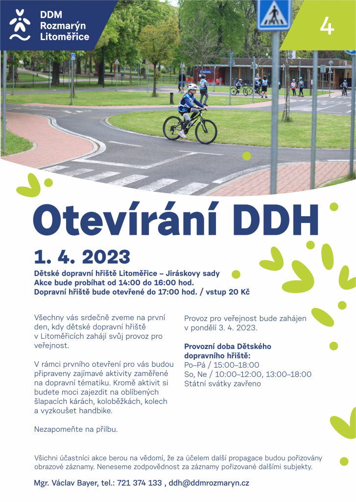 Standardní provoz dětského dopravního hřiště začíná v pondělí 3. dubna Hřiště bude otevřeno od pondělí do pátku od 15 do 18 hodin, o víkendech od 10 do 12 a od 13 do 18 hodin. Státní svátky zavřeno.
