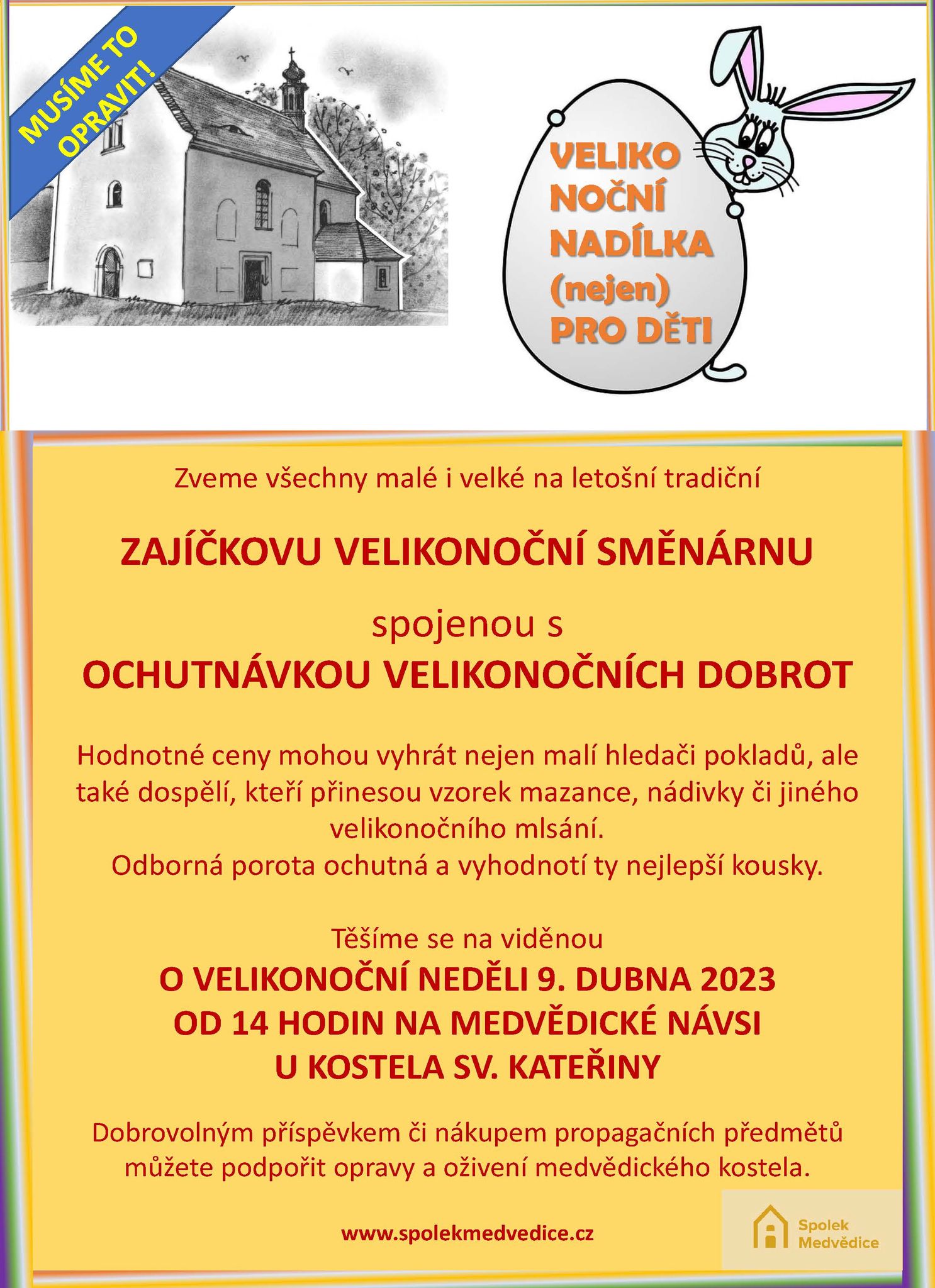 Medvědice – V neděli 9. dubna jste zváni do Medvědic! Na návsi u místního kostela sv. Kateřiny bude od 14 hodin probíhat Zajíčkova velikonoční směnárna s ochutnávkou velikonočních dobrot. Odměny jsou připraveny jak pro děti, tak i pro dospělé – rozhodně přijďte!