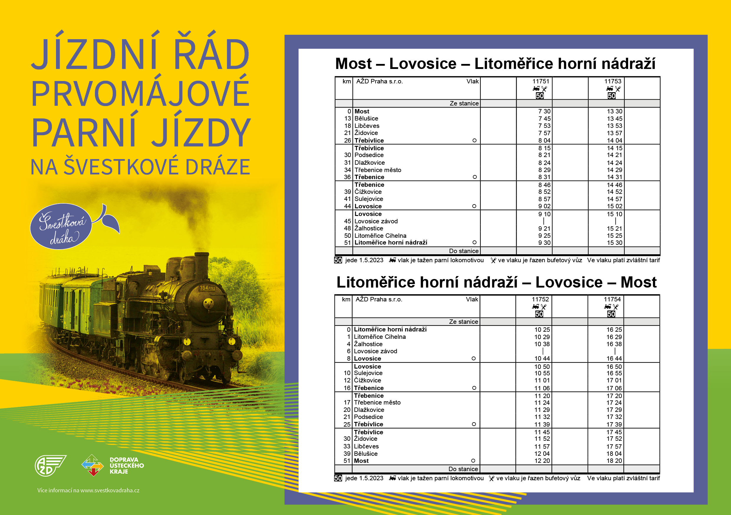Litoměřicko – Pro všechny, kteří chtějí První máj oslavit netradičně s vůní páry, připravila Švestková dráha (Linka U10: Litoměřice horní nádraží – Lovosice – Most) nostalgické parní jízdy. Společnost AŽD v první májový den vypraví historickou soupravu taženou parní lokomotivou 354.195, které se přezdívá Všudybylka.