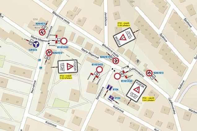 Ulice bude neprůjezdná od křižovatky s ulicí Nezvalova po křižovatku s ulicí Čelakovského.